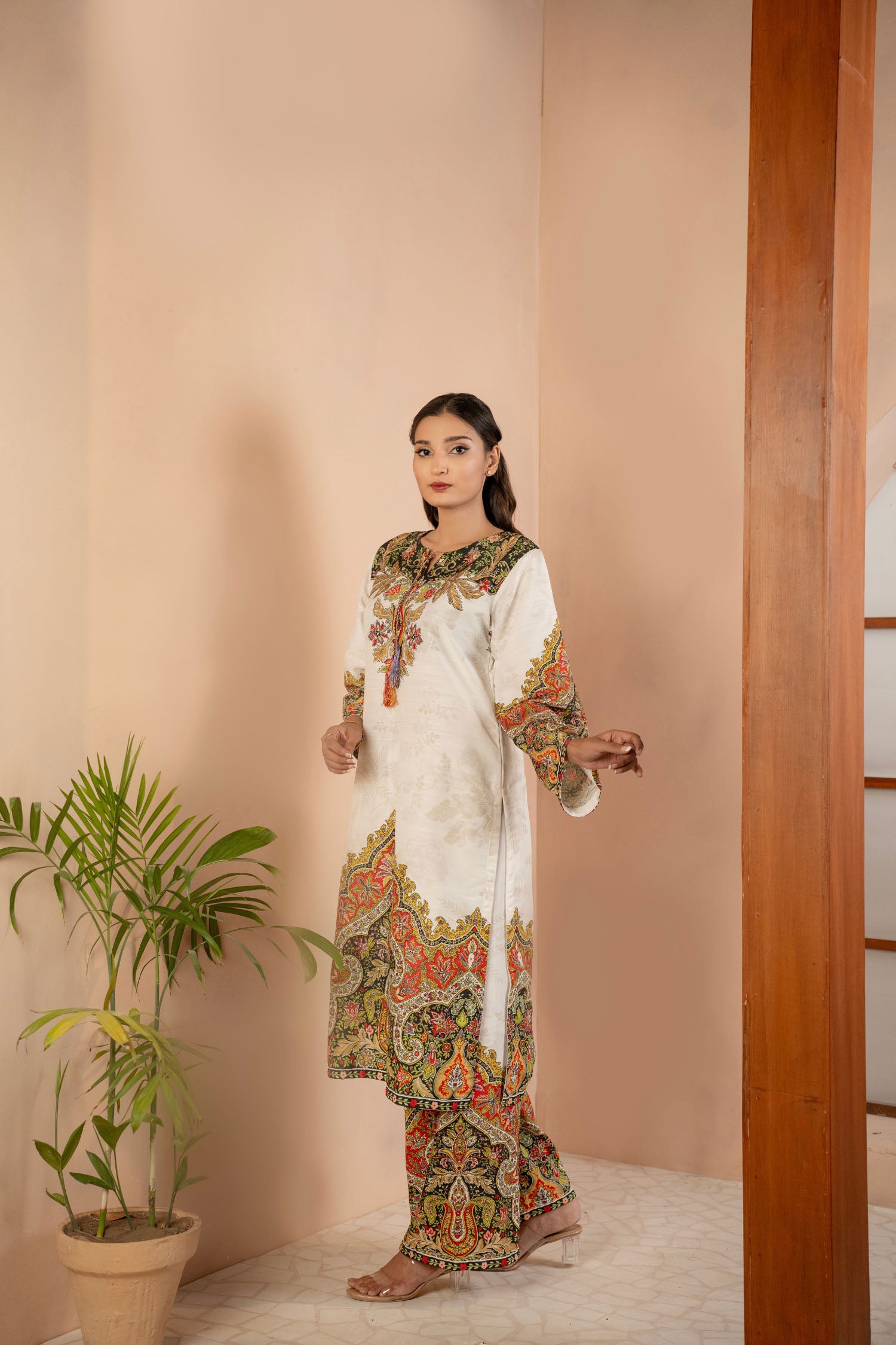 Redefine winter elegance with Grace, a stunning khaddar suit designed to elevate your seasonal wardrobe. Featuring intricate paisley-inspired prints in rich earthy tones, this ensemble blends traditional artistry with a contemporary silhouette. The soft yet durable khaddar fabric offers warmth and comfort, making it ideal for both casual outings and festive gatherings. Step out in Grace and embody effortless sophistication all season long.