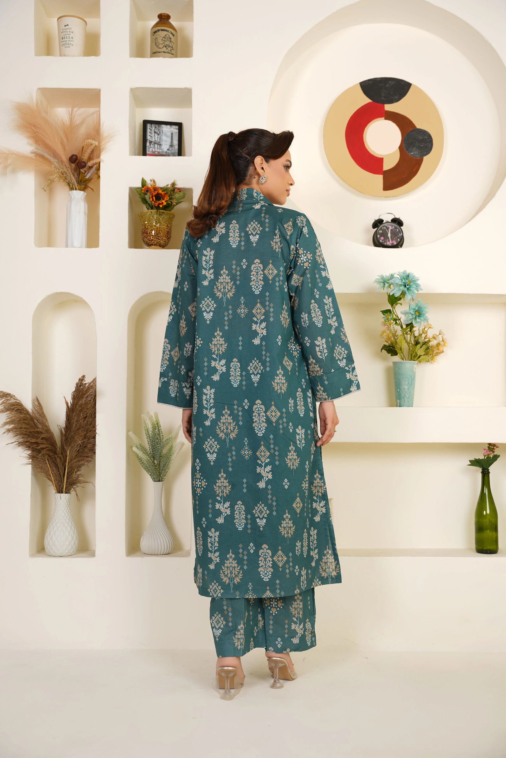 This 2-piece stitched set features a refined kurta and matching straight trousers, crafted from lightweight lawn fabric for breathable comfort. Designed on a rich teal base with white and gold floral patterns, it offers a sophisticated yet effortless charm. The kurta includes side slits and delicate white trim on the cuffs, adding subtle detail to its elegant fit—perfect for casual and semi-formal occasions.