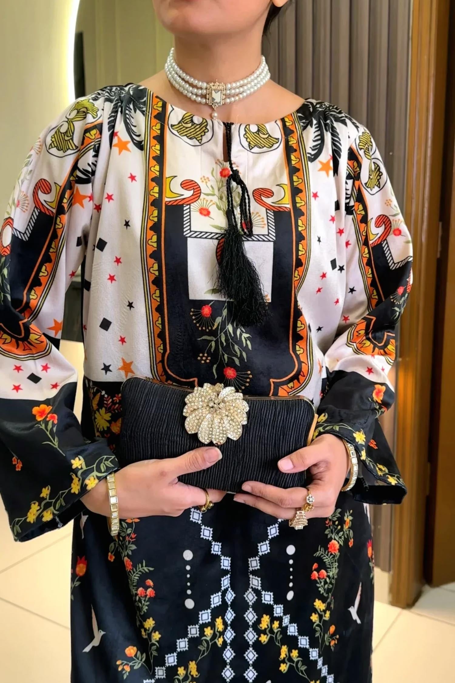 A rich winter velvet suit featuring a contrast bodice and refined digital motifs for a polished, evening-ready look. Soft, warm, and effortlessly stylish for the season.