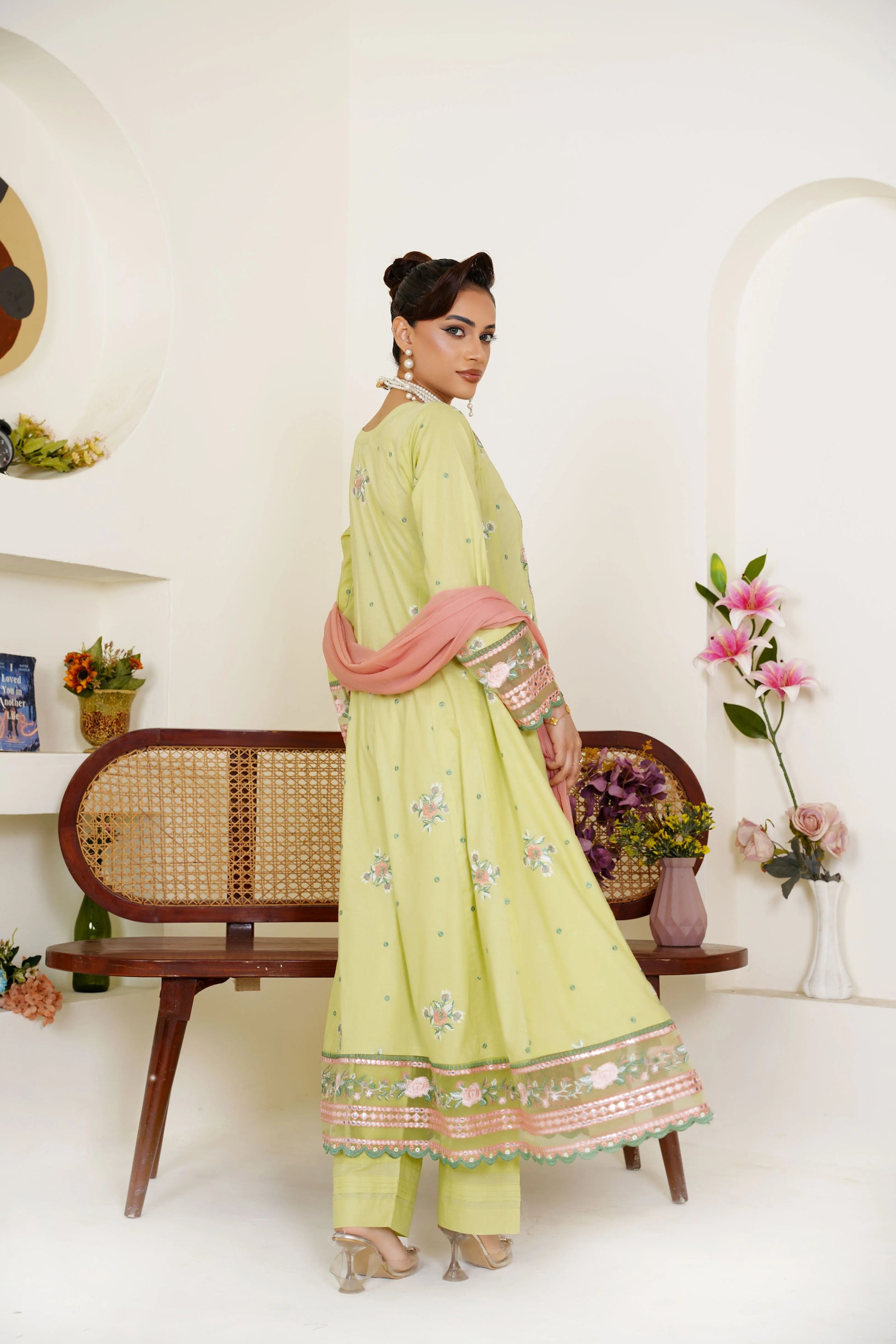 Veloura brings a refreshing charm to your wardrobe with its vibrant lime green canvas, softly balanced by peach accents. The maxi frock-style shirt, crafted from premium lawn, flows gracefully while paired with wide-leg trousers for a modern silhouette. An embroidered chiffon dupatta adds a touch of elegance, making this ensemble a perfect blend of comfort and luxury.