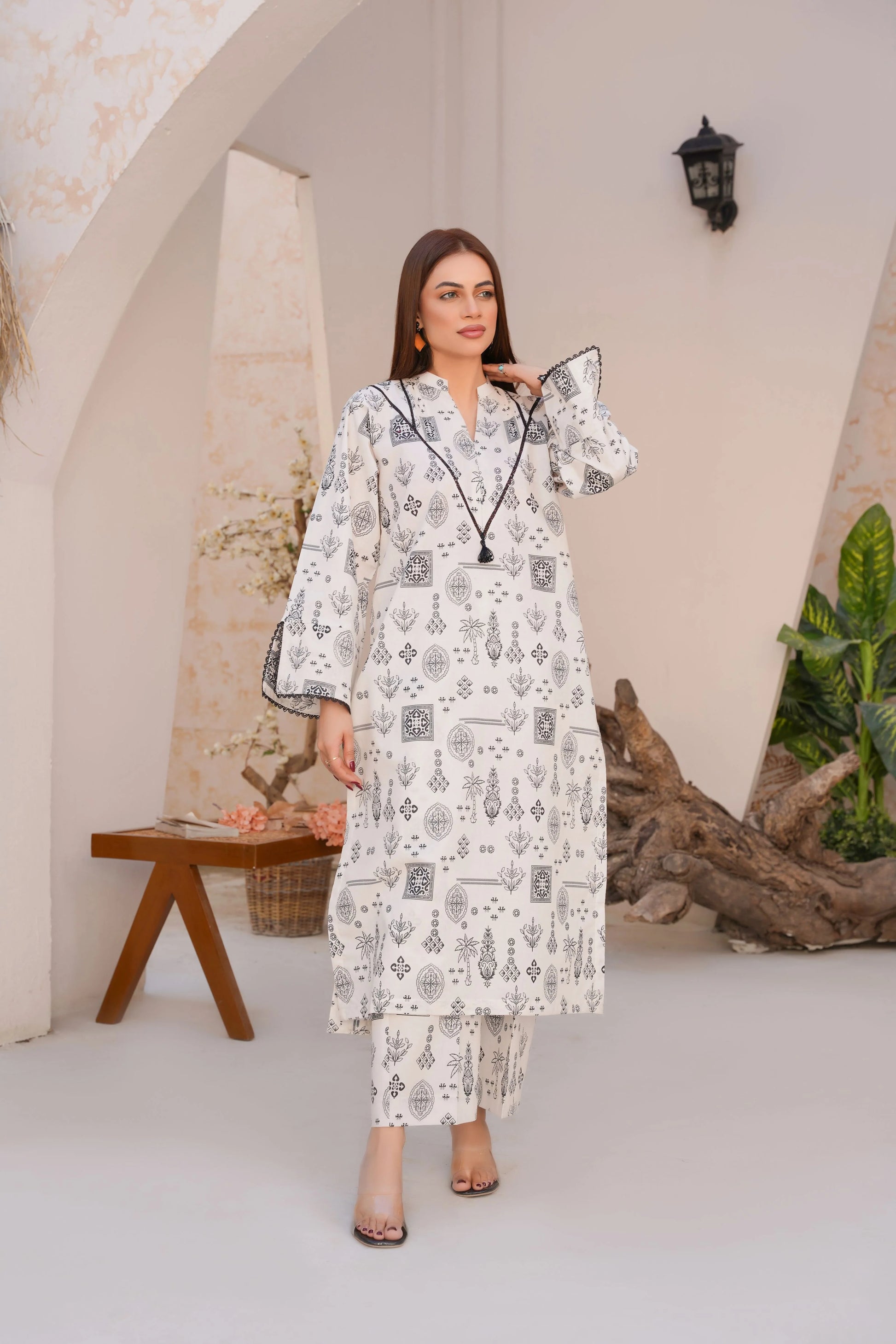 This 2-piece stitched set features a graceful kurta and matching straight trousers, crafted from lightweight lawn fabric for breathable comfort. Designed on a white base with intricate black geometric and floral patterns, it offers a timeless, elegant look. The kurta is detailed with a front button closure and delicate black trim on the cuffs, blending sophistication with effortless wear—perfect for casual or semi-formal occasions.